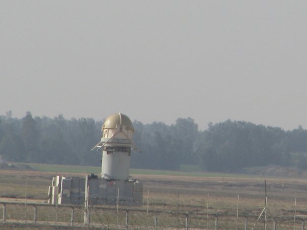 This is an unmanned automatic tower which lines the border at regular 1 km intervals. It opens like a (nasty) flower if movement is detected and it can fire by remote control. And than Israelis talk about the Gazans' hand-made Qassam rockets being a serious threat!
