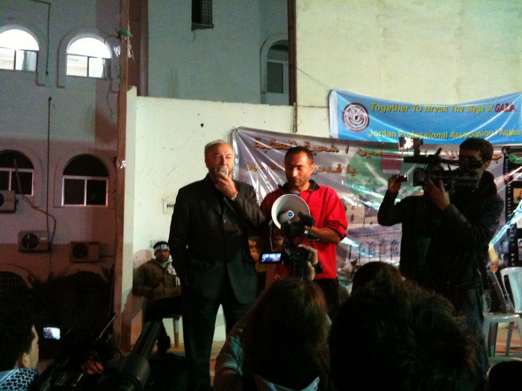 George Galloway and Kevin Ovendon address Viva Palestina convoy members held up in Jordan by Egyptian intransigence, Christmas Day 2009