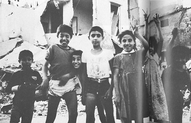 Children of Sabra and Shatila raise the victory salute in front of their destroyed homes after the 1982 massacre. 'We are not afraid. Let the Israelis come.' (Apologies for poor quality. Scanned from Swee Ang's book.)